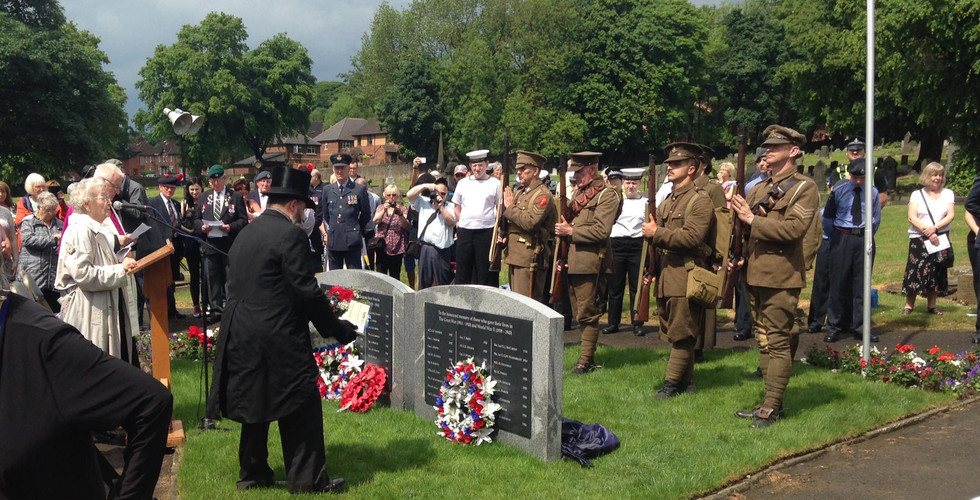 A memorial to the fallen men and women of 2 World Wars was unveiled in Dewsbury Cemetery on Saturday 27 May 2017 by the Deputy Lord Lieutenant of West Yorkshire in presence of local Mayors, Members of Parliament, the organisers and fund raisers the New Friends of Dewsbury Cemetery, the family of Sjt John William Ormsby VC MM, who is also buried in the Cemetery, and members of the public. A 15 minute torrential down pour, which saw dignitaries and guests sheltering under umbrellas in the middle of the Cemetery, didn’t stop the ceremony taking place as planned with the exception of the fly pass by the Battle of Britain flight.